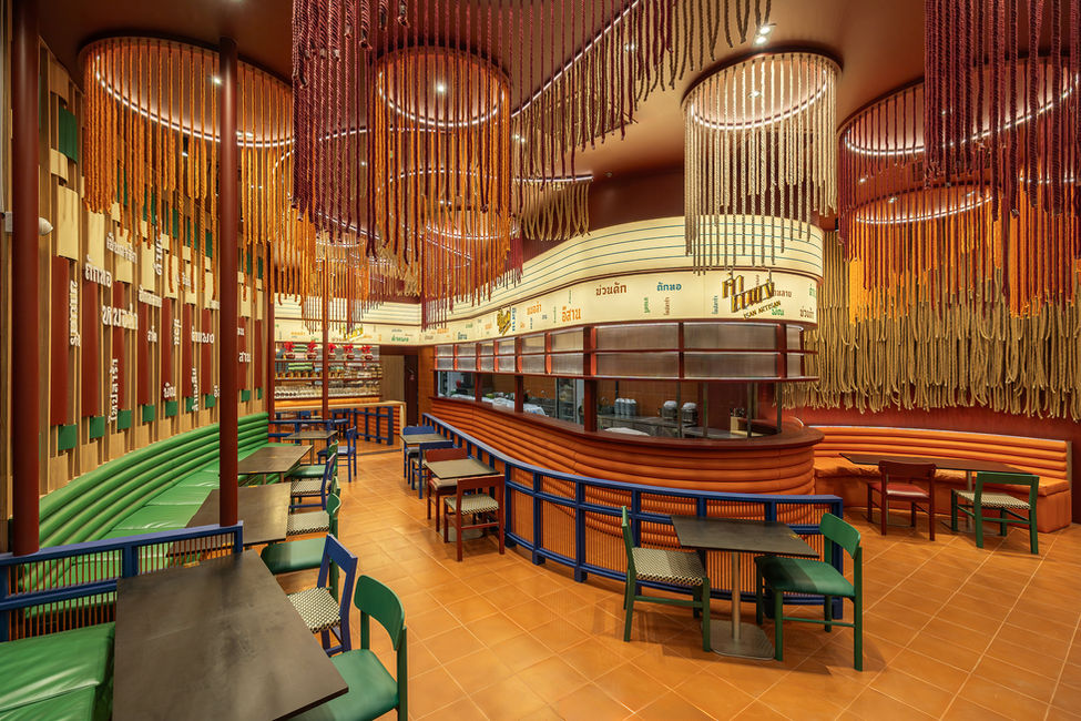 The space is crafted with warm terracotta-red tones, echoing the earthy landscape of the Northeast. Overhead, rhythmic strands of hanging rope evoke the atmosphere of a village ceremonial hall or a Baan Ngaan—a communal gathering space used for monthly merit-making and traditional celebrations.